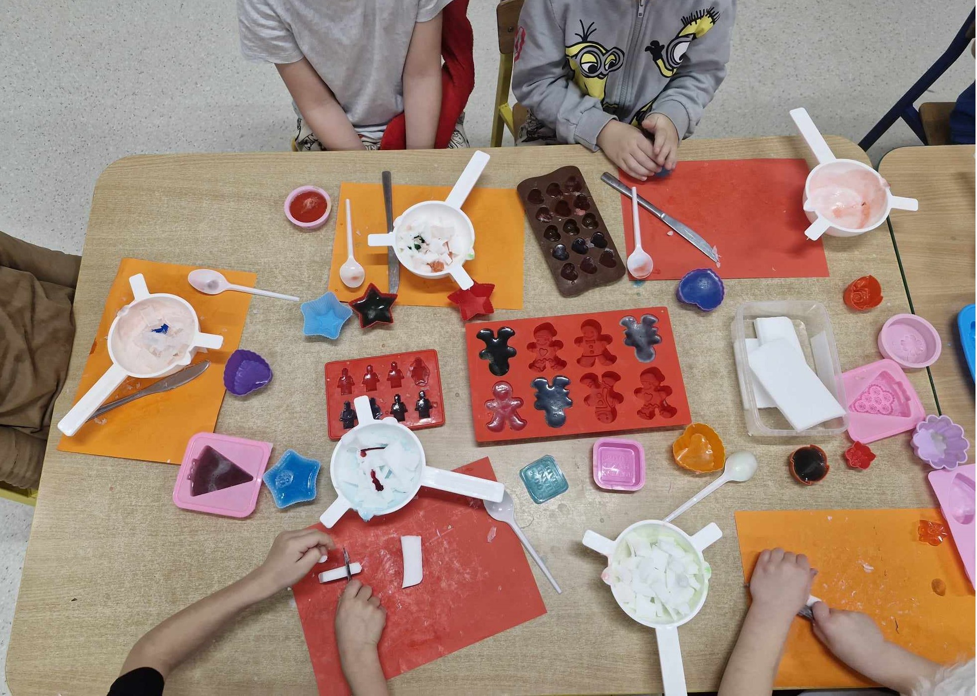 Dzieci z ogromnym entuzjazmem tworzyły swoje kolorowe mydełka. Wielkim zainteresowaniem cieszyła się gliceryna przeźroczysta, którą z zapałem wykorzystywaliśmy do tworzenia mydełek przypominjących czasami pyszne żelki.